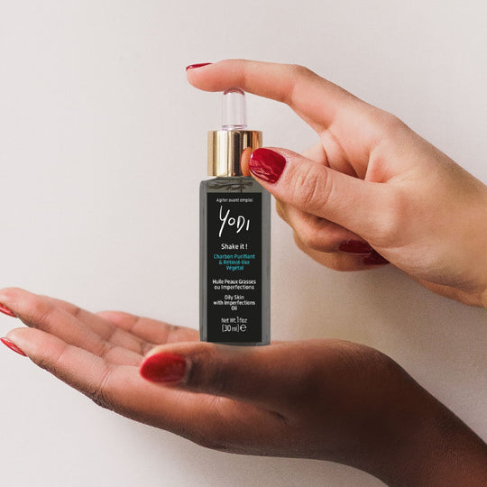 Skin with acne, imperfections or dilated pores is very often oily or combination skin. Oily skin results from a natural overproduction of sebum, which forms an oily film on the skin's surface and clogs pores, leading to the appearance of shine, blackheads, pimples and even acne. This skin imbalance generally emerges during puberty, due to the major hormonal changes taking place at that time, but can also be caused by external factors such as stress, the season, diet, pollution, and so on.