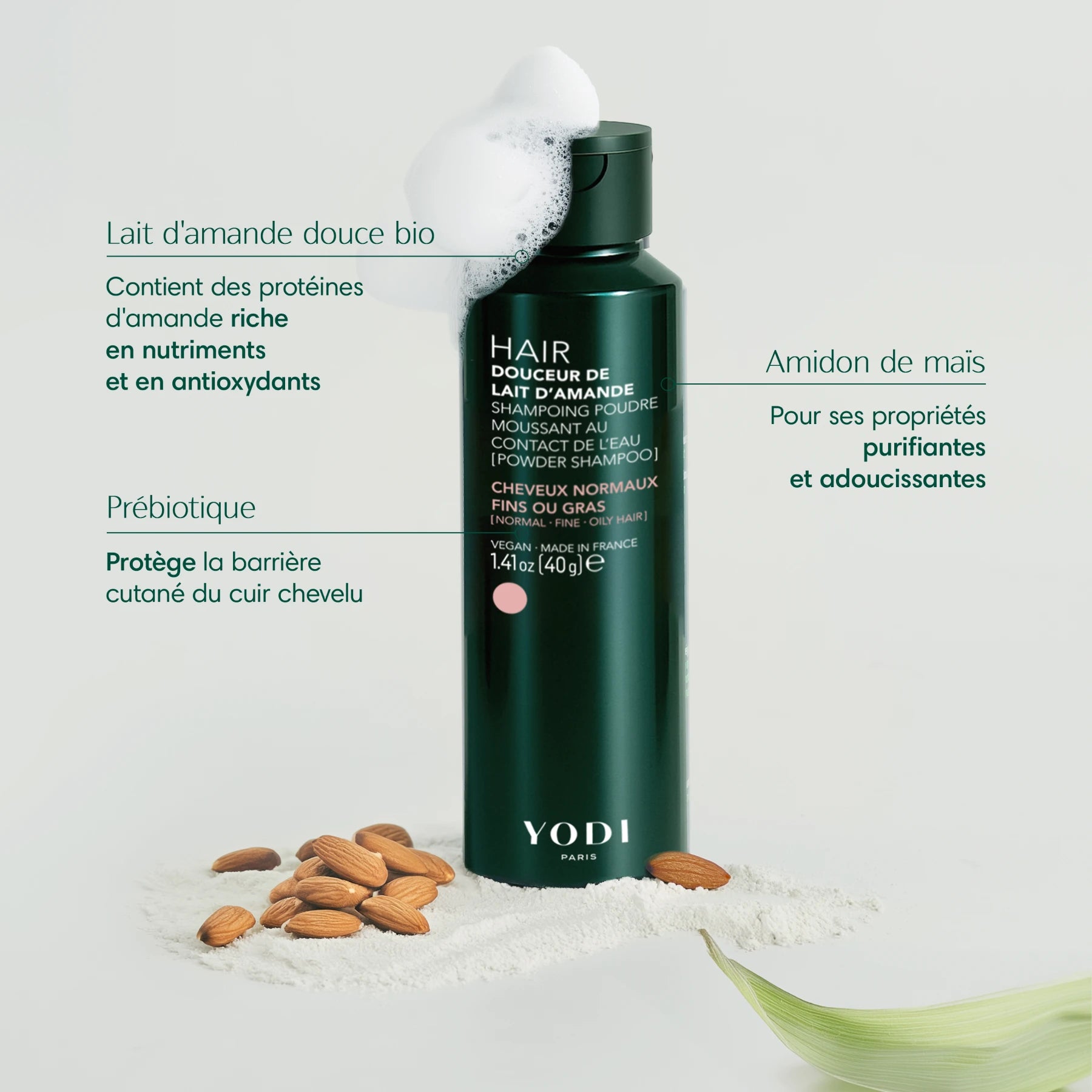 Le Shampoing Volume & Brillance Douceur Lait d'Amande vient ensuite parfaire le rituel en nettoyant le cuir chevelu en douceur, sans l’agresser. Élu n°1 par 60 Millions de Consommateurs, ce shampoing en poudre moussant offre une expérience sensorielle inédite. Sa formule courte et clean — sans conservateurs, sulfates ni silicones — respecte l'équilibre du cuir chevelu tout en apportant volume, éclat et légèreté. Enrichi en lait d’amande douce, protéines végétales, prébiotiques et extraits de riz, il mousse généreusement, se rince facilement et laisse la chevelure souple, aérienne et lumineuse.