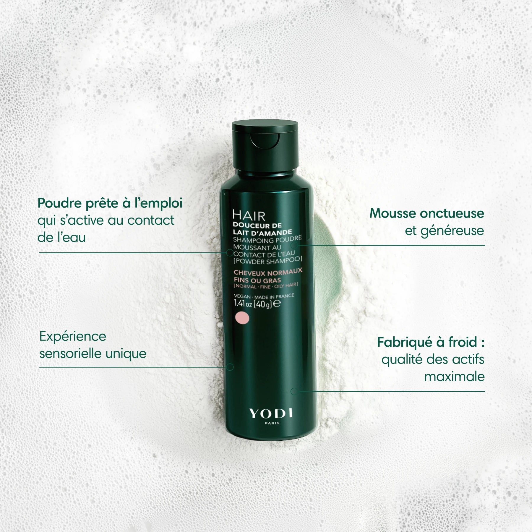 - Nos 2 shampoings sont en poudre, sans eau, donc sans conservateurs, et formulés sans allergènes pour limiter les irritations. Chez Yodi, nous croyons qu’un cheveu sain commence par un cuir chevelu fort. Nos formules intègrent un prébiotique, des tensioactifs doux et un pH respectueux du cuir chevelu.