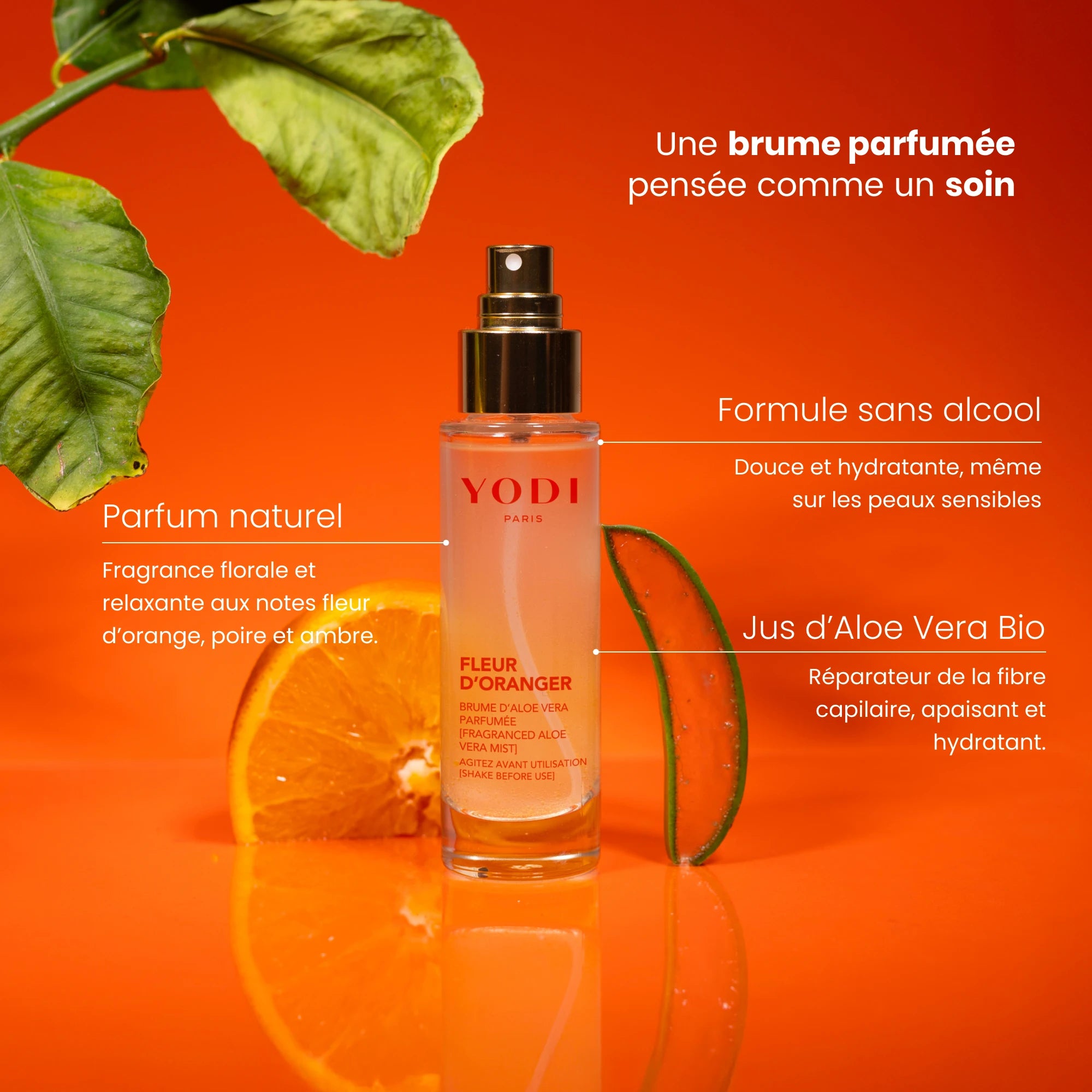 Une brume au voile de poire, fleur d'oranger et ambre qui s'invite sur la peau et les cheveux comme un bijou invisible. Formule sans alcool, 100 % active, à base de jus d'Aloe Vera bio et de parfum 100 % d'origine naturelle. Légère et respectueuse des peaux sensibles.